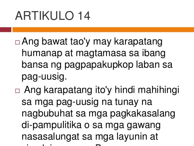 • karapatan ng pilipinas na maging malaya sa pakikialam ng ibang bansa. Kasali rito ang karapatan ng isang tao “na magbago ng kaniyang relihiyon o paniniwala,” lakip na ang kalayaan “na magpahayag ng kaniyang relihiyon o paniniwala sa turo, gawain, pagsamba at pangingilin.” —artikulo 18. Sapagkat ang mga mamamayan ng mga bansang nagkakaisa ay nagpatibay sa karta ng kanilang pananalig sa mga saligang karapatan ng tao, sa karangalan at kahalagahan ng pagkatao at sa pantay na mga karapatan ng mga lalaki at babae at nagpapasiyang itaguyod ang kaunlarang panlipunan at lalong mabubuting pamantayan ng buhay sa lalong malaking kalayaan.